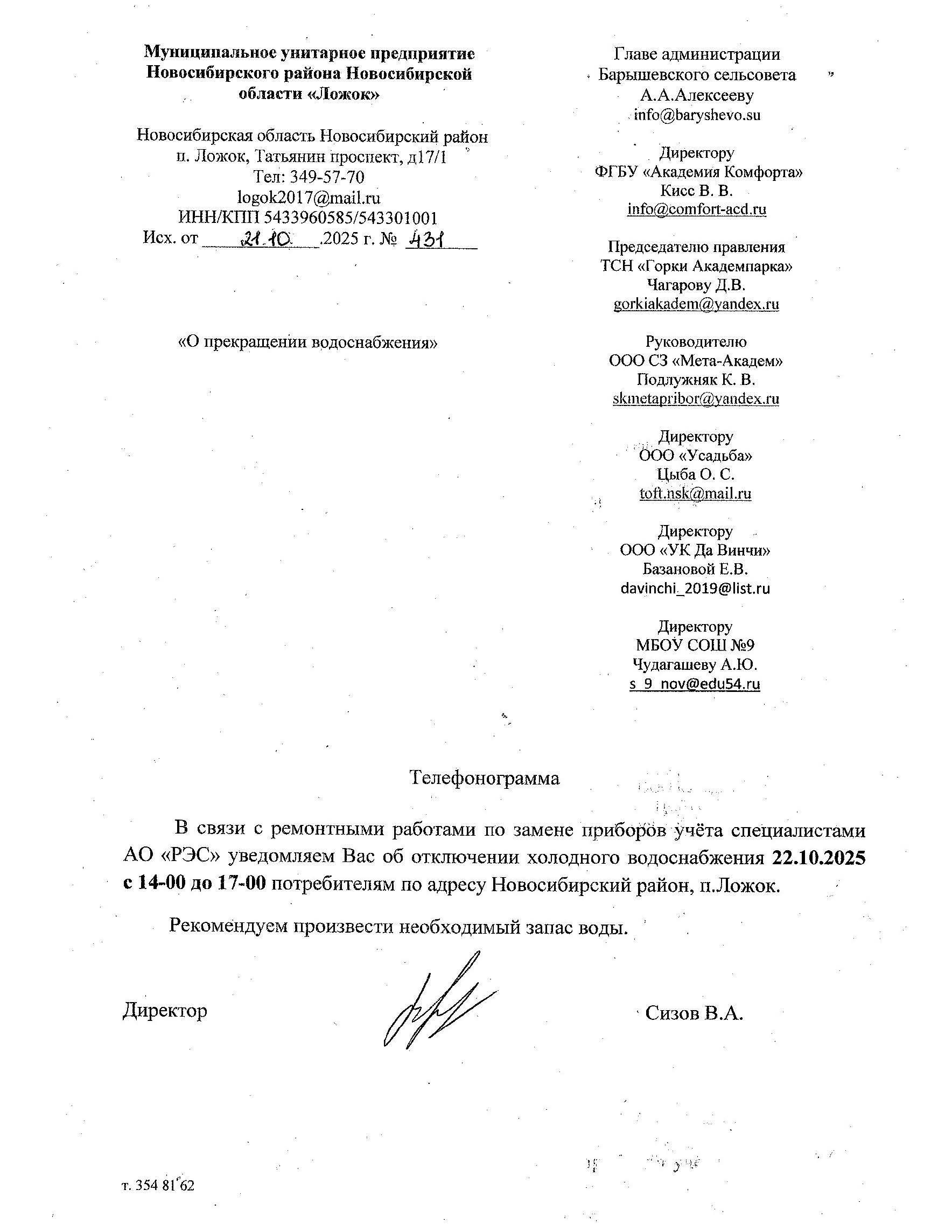 Отключение водоснабжения 22.10.2025 п.Ложок
